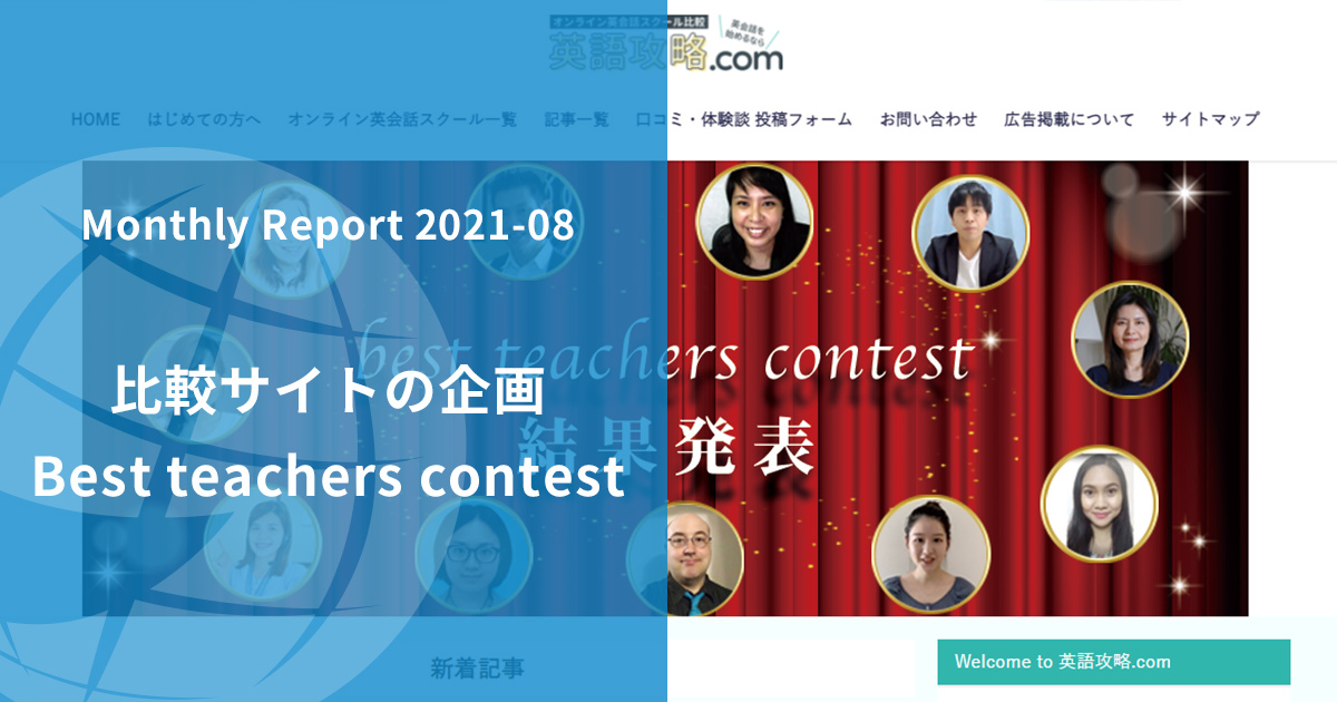 WTEノウハウ動画 比較サイトの企画とBest teachers contest(2021年8月ワールドトークマンスリーレポート) WTE運営事務局 2021年10月15日 2021年8月のワールドトークマンスリーレポートです ワールドトークで実際に行っている施策をレポートしました。今回はBest teachers contestという比較サイトの企画を使ったノウハウ動画となります。 ABOUT ME WTE運営事務局 「日本のオンライン教育を促進させる」 を事業ミッションとして、全国の教育事業者様にオンラインレッスンのプラットフォーム「WTE(ワールドトークエンジン)」のご提供をしております。 システムの導入実績はこれまで130社以上。多くのオンラインレッスンサイトでご利用いただいております。 BLOG:https://demo1.hpkobo.jp/column