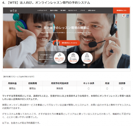 その中でも、WTEは法人向けのオンラインレッスン専門の予約システムという位置づけで、システムの使い勝手からそれぞれの画面説明、導入事例を紹介いただいております。