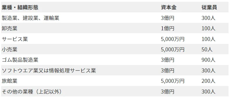 資本金あるいは従業員規模(常勤)の一方が、下記以下の対象の場合